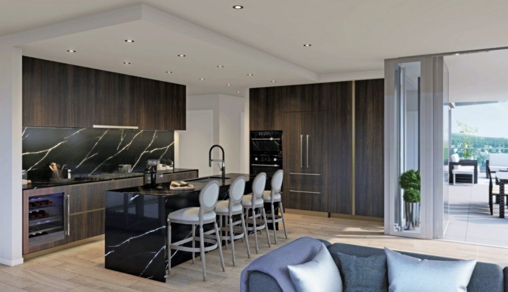 Large terraces for seamless indoor-outdoor living and entertaining. The kitchen is a feast for the eyes with luxurious marble style quartz countertops, Miele appliances, and European style cabinetry. Interiors are customized to individual tastes with two expertly crafted colour schemes: Pearl (light) and Onyx (dark)