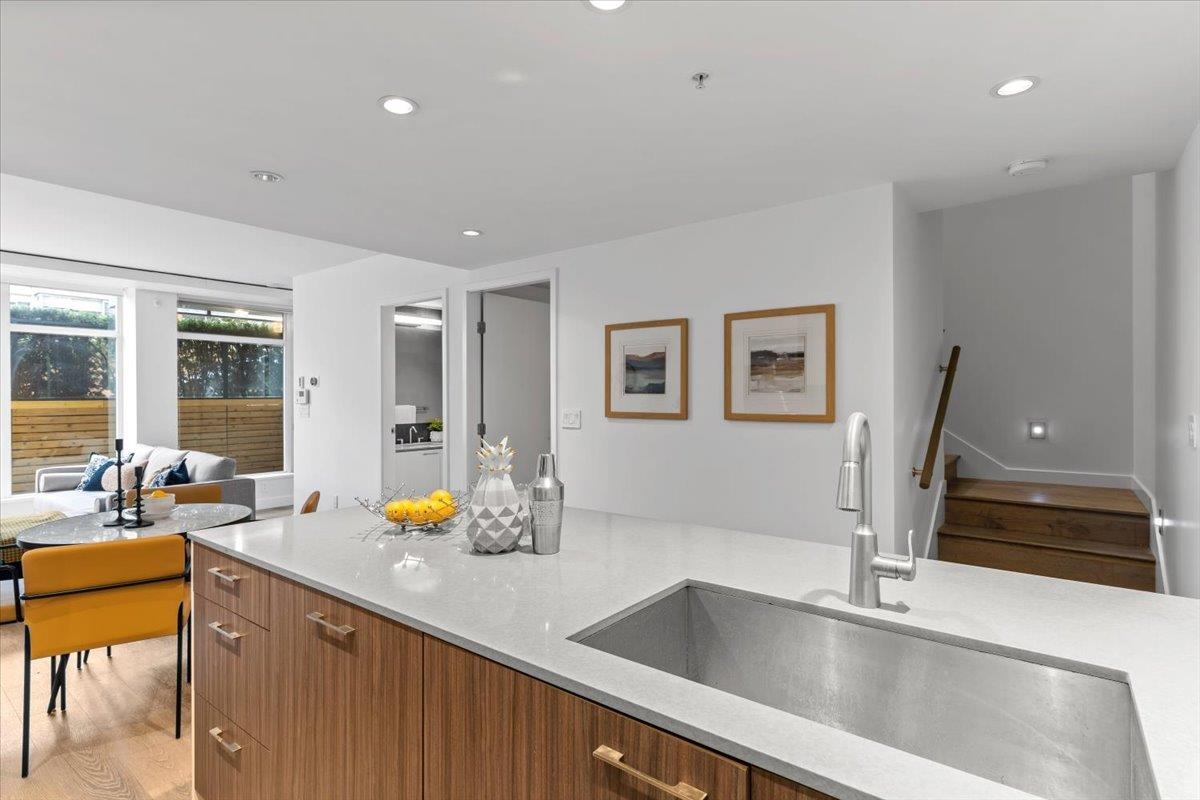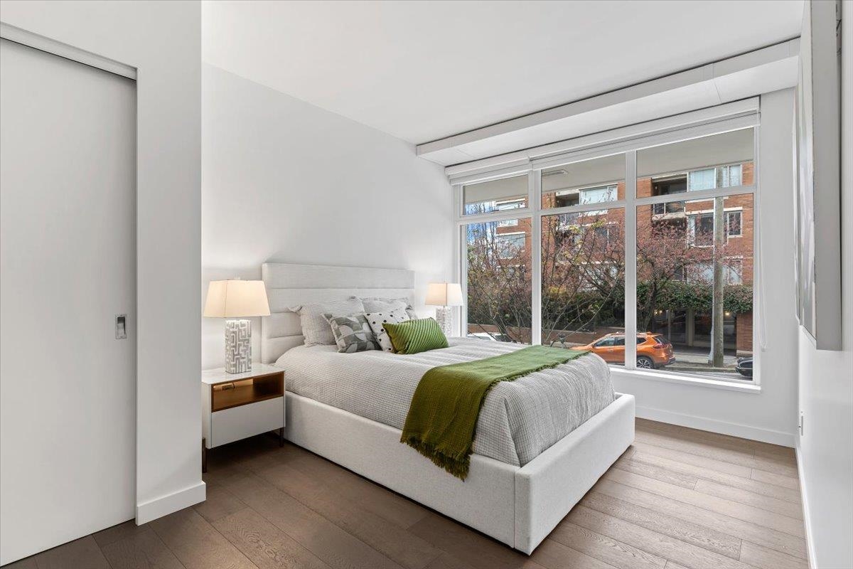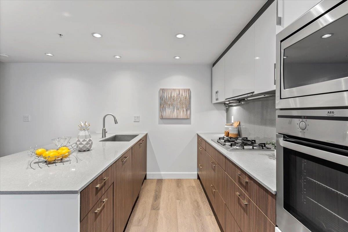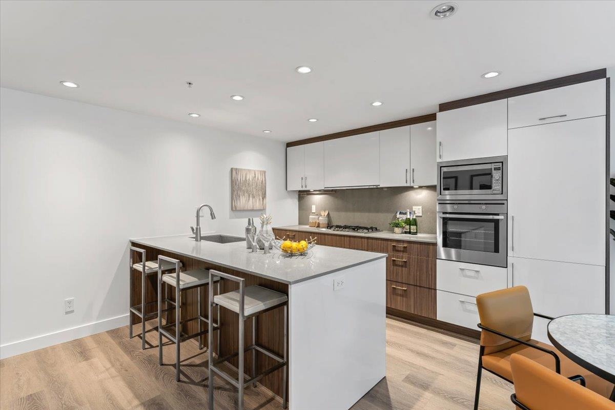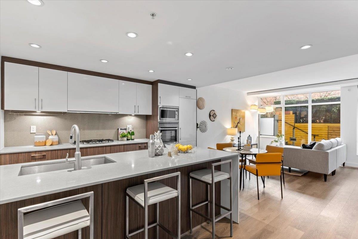 Welcome to 700 WEST 8TH, by Westbank & Peterson Group. Luxurious interiors by MGB Design complement the iconic building design by Henriquez Partners Architects. This elegant 2-level townhome boasts a generous main living area that seamlessly connects to a spacious kitchen and dining space, perfect for entertaining. The kitchen features a large island with a breakfast bar and high-end s/s appliances. Throughout the home, enjoy radiant heating and sleek oak floors. The main floor includes a convenient powder room and storage that can double as an office. Upstairs, discover 2 bdrm, 2 full baths, and laundry. Recently painted with new high-end blinds for added privacy, this home is move-in ready. Situated in a prime location near the Canada Line, VGH, Whole Foods and much more!